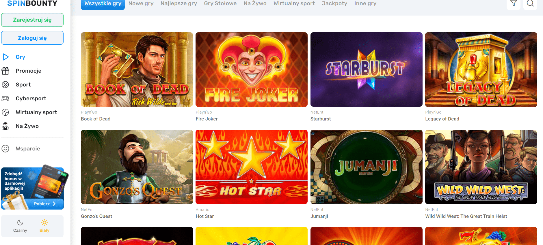 Najlepsza nawet oferta bonusowa nie miałaby sensu, gdyby gracze nie mieli zbyt wielkiego wyboru liczby gier w kasynie – ale pod tym względem kasyno SpinBounty wypada po prostu znakomicie. Możesz tutaj zagrać w najlepsze gry hazardowe wybrane z portfolio takich dostawców, jak na przykład Booongo, Spinomenal, BetSoft, Microgaming, BF Games, Playson, Platipus, Nucleus, ELK Studios, Tom Horn Gaming, VIVO Gaming, iSoftBet, Yggdrasil, BGaming, Push Gaming, Kalamba Games, Wazdan Gaming, Apollo Games, Endorphina, Lucky Streak, Merkur Gaming, Iron Dog Studios, Bet 2 Tech, Habanero, Leap Gaming, BTG, Betixon, Evoplay, Pariplay, Belatra… a to tylko część z niezwykle rozbudowanej listy firm dostarczających kasyno gry automaty dla SpinBounty! Początkujący powinni zwrócić uwagę na gry takich producentów, jak na przykład:
