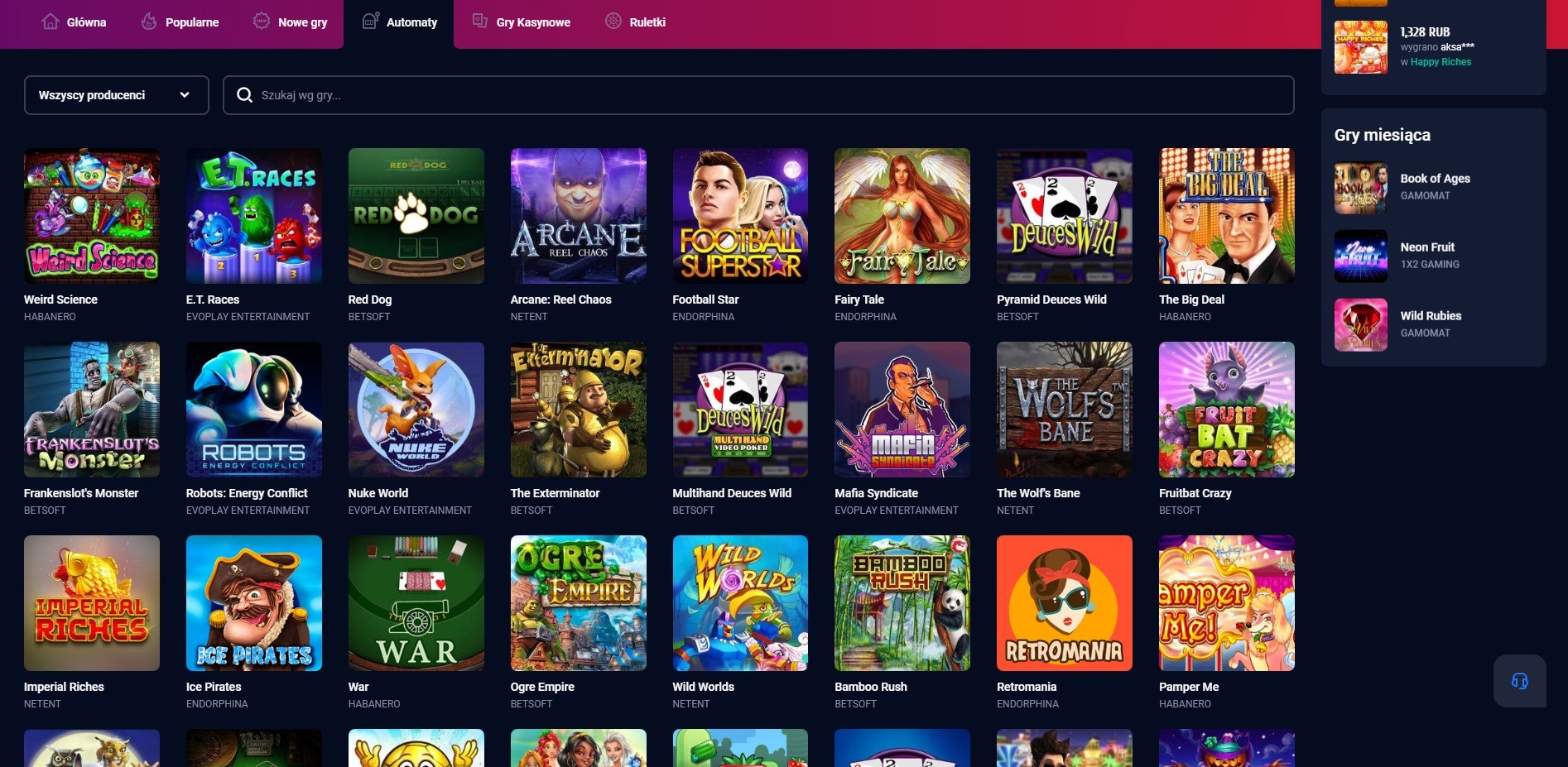 Kasyno oferuje szeroki asortyment automatów slotowych. Za ich wysoką jakość odpowiadają najlepsi dostawcy na świecie. Wśród nich należy wyróżnić takie firmy jak: Gamomat, Endorphina, Habanero, Amatic, Evoplay, Isoftbet, Kiron, 1×2 gaming, Betsoft, Netent, Kalamba, Golden Hero, Oryx oraz Tom Horn.