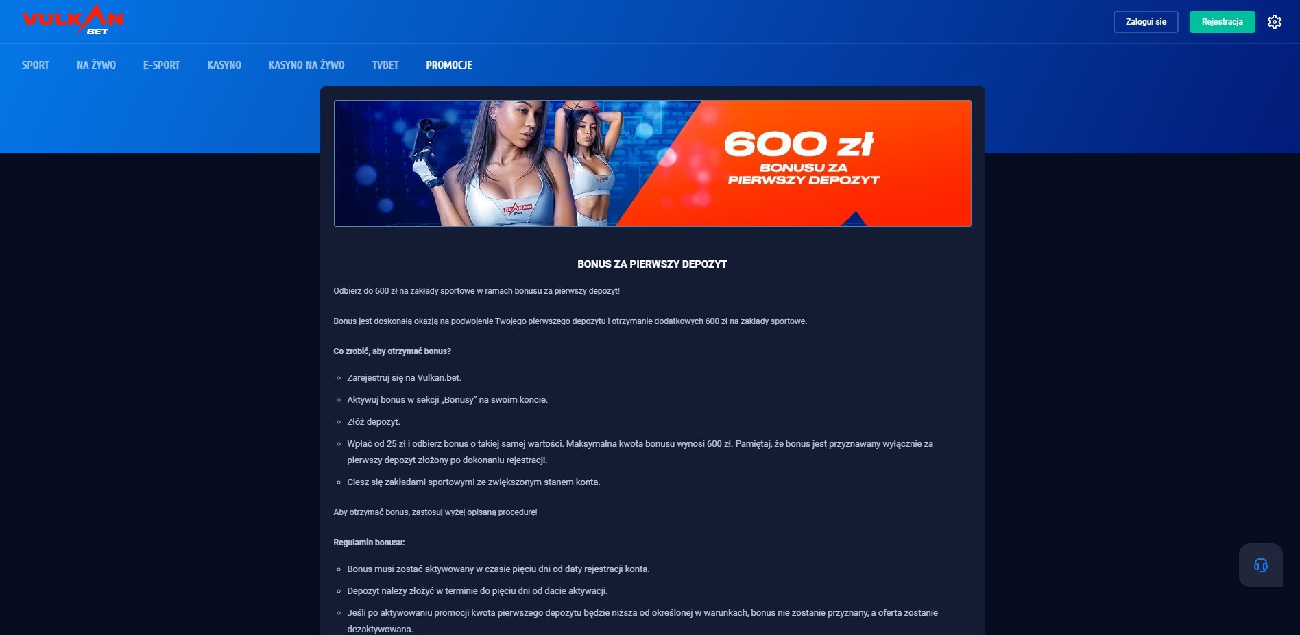 Vulkan Bet, podobnie jak każde inne kasyno internetowe, stara się przyciągnąć nowych graczy. W tym celu stosuje różnego rodzaju zachęty i promocje. Najbardziej popularną formą promocji jest bonus powitalny dla nowego gracza. Polega on na tym, że każdy gracz, który zarejestruje konto (przejdzie przez proces rejestracji) i w ciągu 5 dni dokona aktywacji bonusu może zdobyć bonus powitalny.